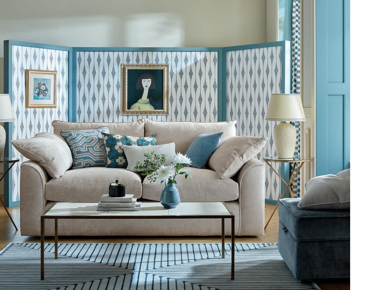 Nothing heralds the arrival of summer more than seaside-inspired blue and white. But make it modern by playing with scale and proportion in terms of fabrics and furniture size. Think extra wide cabana stripes (perfect for an occasional chair or an overscaled coffee table) juxtaposed with some fresh, unfussy florals, whether via wallpaper or cushions. Vary scale by opting for a pinstripe rug, whose thinner lines create more of a graphic and grounding focal point. This is a good time of year to play with furniture configuration too. Try repositioning sofas to take advantage of garden views, opening out your scheme to the natural world. Another playful option is to upholster a folding screen in a favourite botanical or wave fabric. As well as acting as a fresh new canvas to a scheme (and hiding anything unsightly), it also introduces movement and depth. Try placing a sofa in front of it, creating an instant focal point. For a serene look, the Georgio in Oyster chenille provides a softening counterpoint to plenty of pattern, while a Steel Blue colourway plays into the soft blues and off-whites trend. This is a sofa that is available as a corner or U-shape, ideal for maximum flexibility.