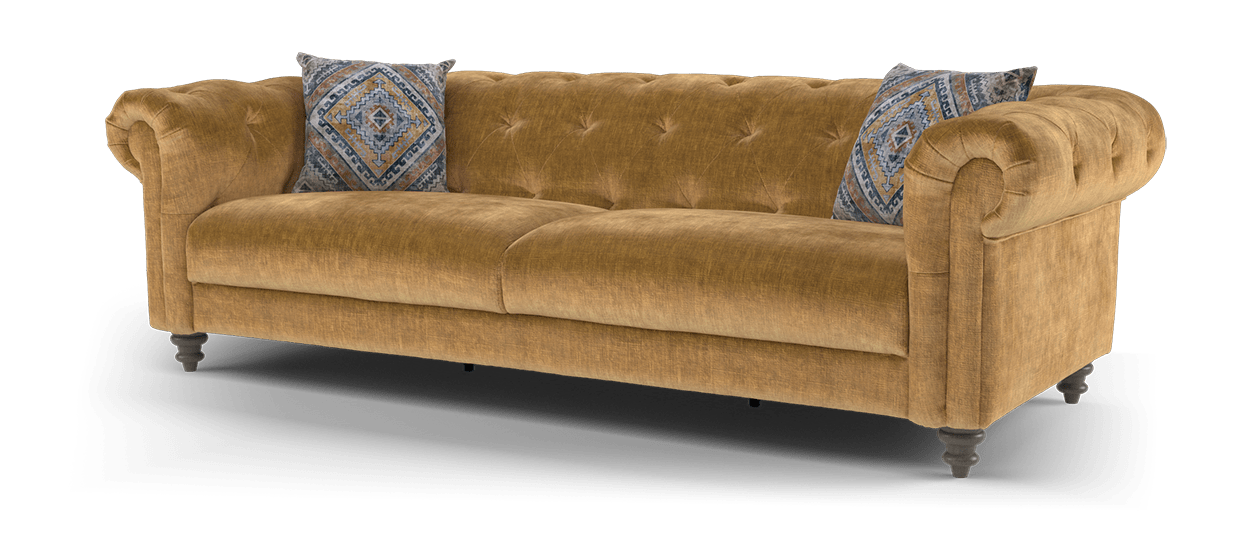 Crafted from luxurious velvet or soft chenille fabric, the Kensington is a contemporary twist on classic Chesterfield style. Intricately accented with beautiful scrolled arms, bandage pleating, and deep blind button detail, the sofa sits on hand turned solid wood feet in a choice of walnut or weathered oak shades.